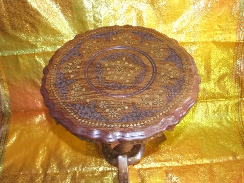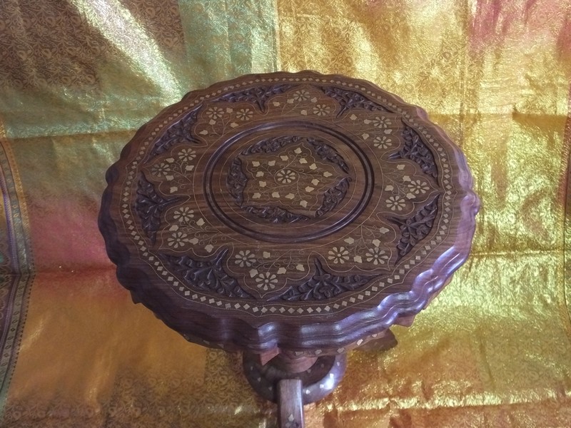 Guéridon en bois de rose sculpté à la main – incrustations en laiton.