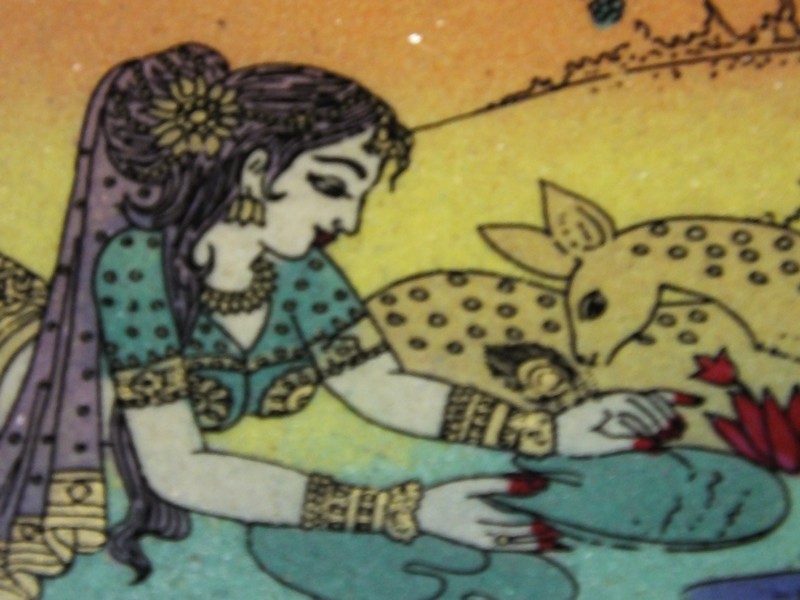 Le décor est fait de différentes poudres de pierres semi-précieuses collées en aplat de peinture, le tout protégé par un verre.